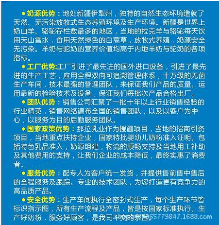 做駱駝奶粉為什么選擇那拉乳業(yè)? 1、奶源地工廠,駱駝奶源豐富; 2、全新自動化生產(chǎn)設(shè)備,品質(zhì)保證; 3、奶粉生產(chǎn)中先進干濕法生產(chǎn)工藝,用嬰幼兒的生產(chǎn)標(biāo)準(zhǔn)嚴(yán)控產(chǎn)品; 4、擁有國家許可的特色乳品(駱駝奶)生產(chǎn)許可證; 5、位于那拉提核心景區(qū)旁,周邊旅游配套資源豐富;