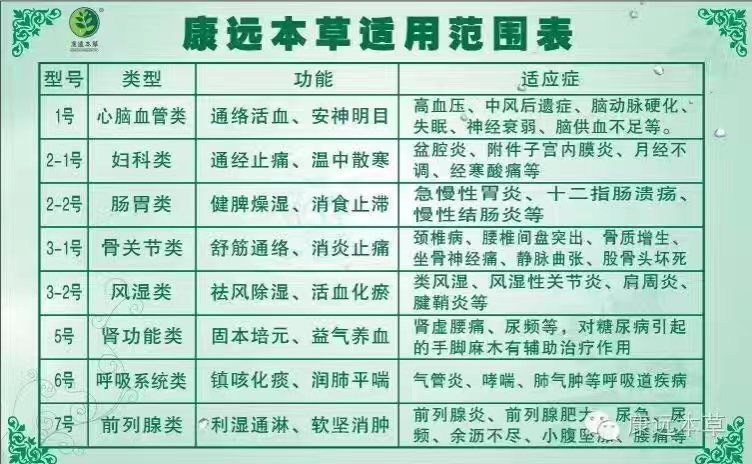 主要用于關(guān)節(jié)炎、肩周炎、頸椎病、坐骨神經(jīng)痛、凍瘡、濕疹、類(lèi)風(fēng)濕、肌纖維組織炎、軟組織挫傷、腱鞘炎、腰肌勞損、骨質(zhì)增生、腰腿疼、腰椎盤(pán)突出、網(wǎng)球肘炎、臂叢神經(jīng)痛、手腳麻木、中風(fēng)后遺癥、高血壓、肌肉酸痛、腰膝酸軟、注射后反應(yīng)硬結(jié)、痔瘡、前列腺炎、神經(jīng)性和血管性頭痛、感冒、急慢性支氣管炎、胃腸功能紊亂、婦科病等多種常見(jiàn)疾病的治療與保健。 對(duì)慢性病及頑固疾病有良好的治療作用,打針,吃藥治不好的病,用康遠(yuǎn)本草可以做得到